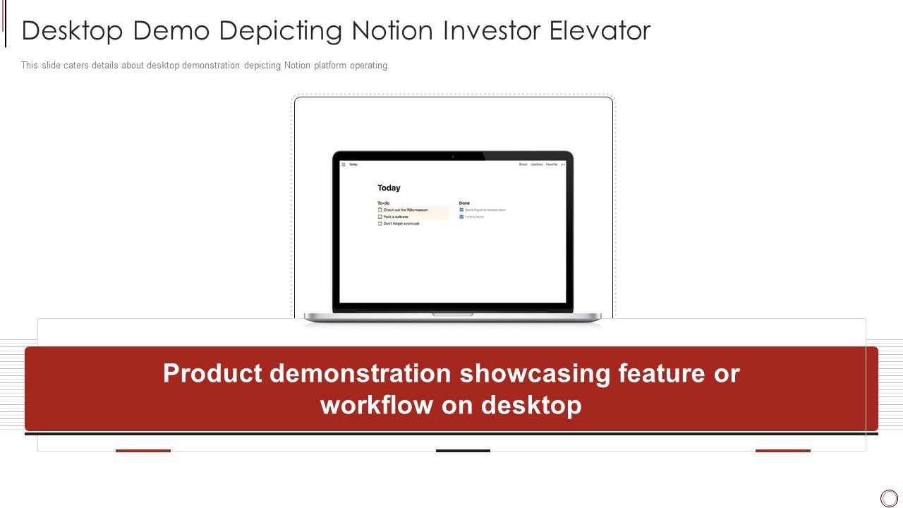 This slide caters details about desktop demonstration depicting Notion platform operating. This is a notion investor elevator desktop demo depicting notion investor elevator themes pdf template with various stages. Focus and dispense information on one stages using this creative set, that comes with editable features. It contains large content boxes to add your information on topics like desktop demo depicting notion investor elevator. You can also showcase facts, figures, and other relevant content using this PPT layout. Grab it now.