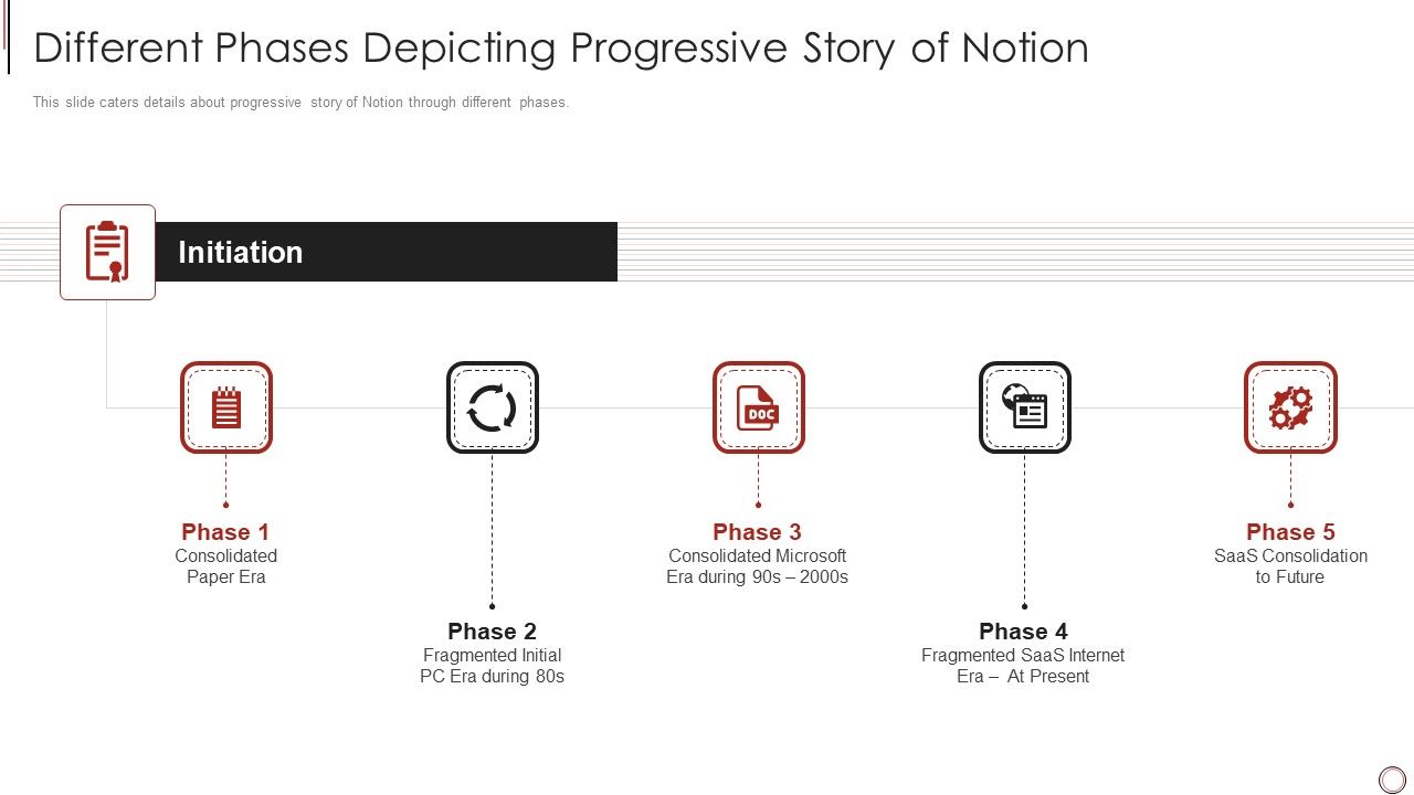 This slide caters details about progressive story of Notion through different phases. This is a notion investor elevator different phases depicting progressive story of notion slides pdf template with various stages. Focus and dispense information on five stages using this creative set, that comes with editable features. It contains large content boxes to add your information on topics like different phases depicting progressive story of notion. You can also showcase facts, figures, and other relevant content using this PPT layout. Grab it now.