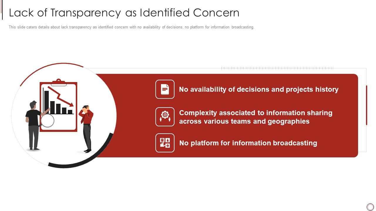 This slide caters details about lack transparency as identified concern with no availability of decisions, no platform for information broadcasting. This is a notion investor elevator lack of transparency as identified concern slides pdf template with various stages. Focus and dispense information on three stages using this creative set, that comes with editable features. It contains large content boxes to add your information on topics like teams and geographies, decisions and projects history, information broadcasting. You can also showcase facts, figures, and other relevant content using this PPT layout. Grab it now.