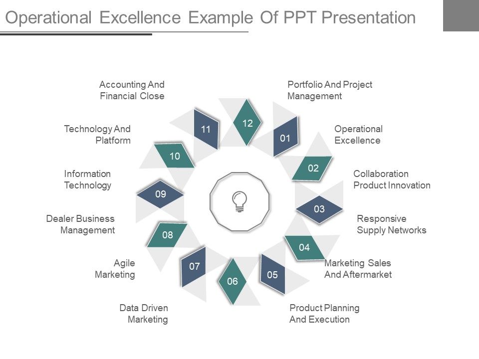This is a operational excellence example of ppt presentation. This is a twelve stage process. The stages in this process are portfolio and project management, operational excellence, collaboration product innovation, responsive supply networks, marketing sales and aftermarket, product planning and execution.