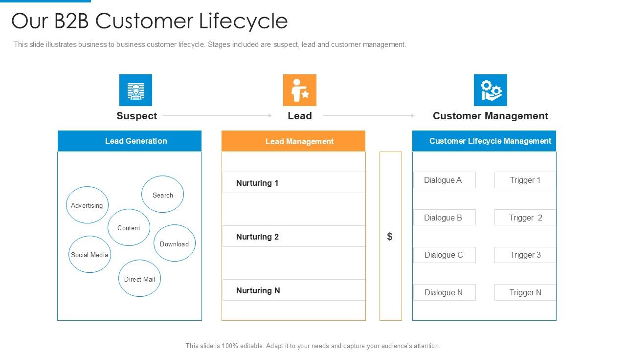 This is a our b2b customer lifecycle sample pdf template with various stages. Focus and dispense information on three stages using this creative set, that comes with editable features. It contains large content boxes to add your information on topics like lead generation, lead management, customer lifecycle management. You can also showcase facts, figures, and other relevant content using this PPT layout. Grab it now.