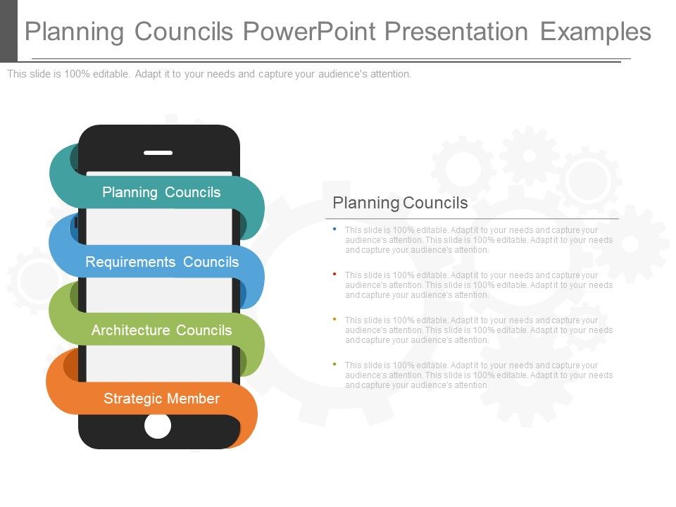 This is a planning councils powerpoint presentation examples. This is a four stage process. The stages in this process are planning councils, requirements councils, architecture councils, strategic member.