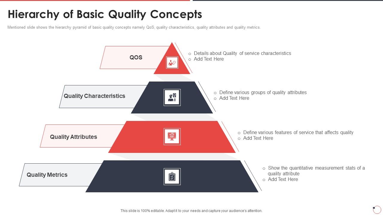 Mentioned slide shows the hierarchy pyramid of basic quality concepts namely QoS, quality characteristics, quality attributes and quality metrics. Presenting quality assurance templates set 1 hierarchy of basic quality concepts ppt summary demonstration pdf to provide visual cues and insights. Share and navigate important information on four stages that need your due attention. This template can be used to pitch topics like quality attributes, quality metrics, quality characteristics, qos. In addtion, this PPT design contains high resolution images, graphics, etc, that are easily editable and available for immediate download.