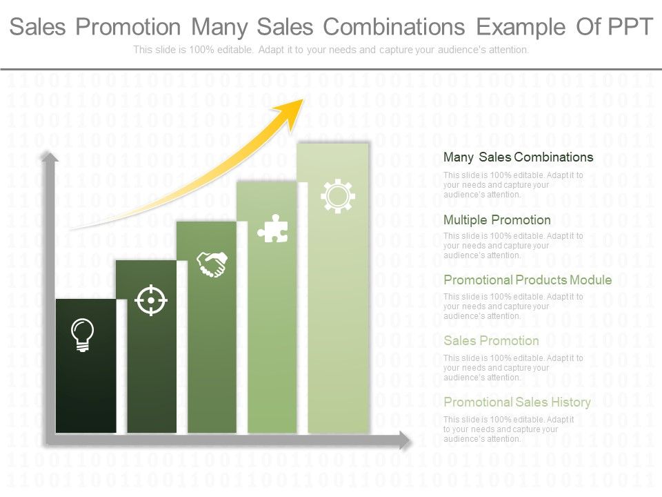 This is a sales promotion many sales combinations example of ppt. This is a five stage process. The stages in this process are many sales combinations, multiple promotion, promotional products module, sales promotion, promotional sales history.