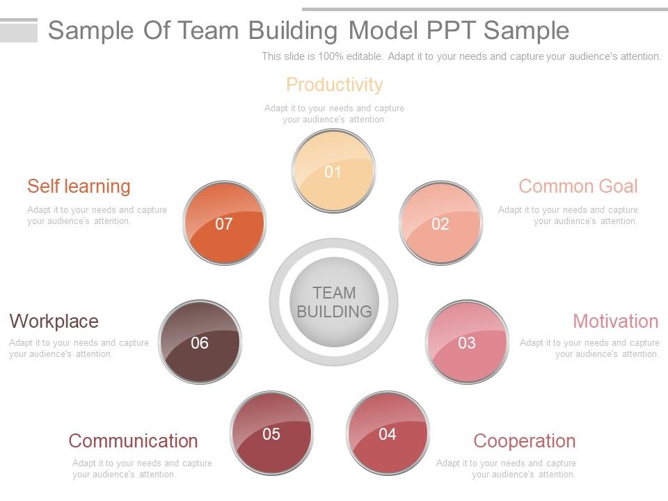 This is a sample of team building model ppt sample. This is a seven stage process. The stages in this process are productivity, self learning, workplace, communication, cooperation, motivation, common goal.