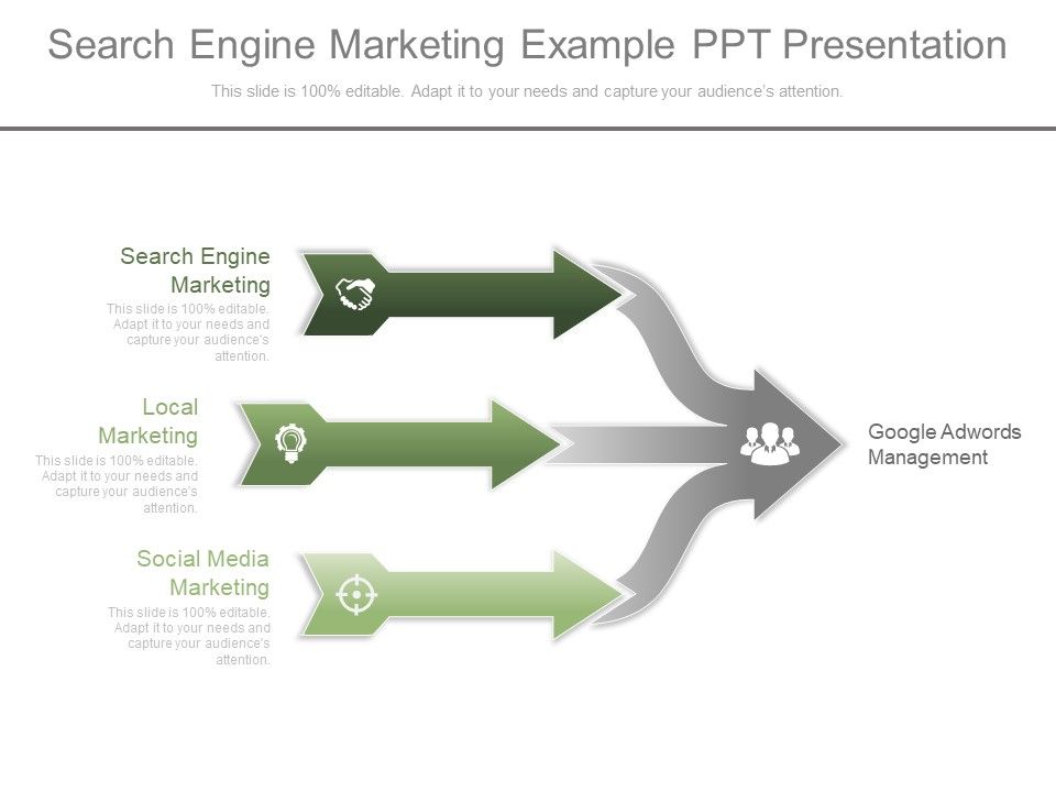 This is a search engine marketing example ppt presentation. This is a three stage process. The stages in this process are search engine marketing, local marketing, social media marketing, google adwords management.