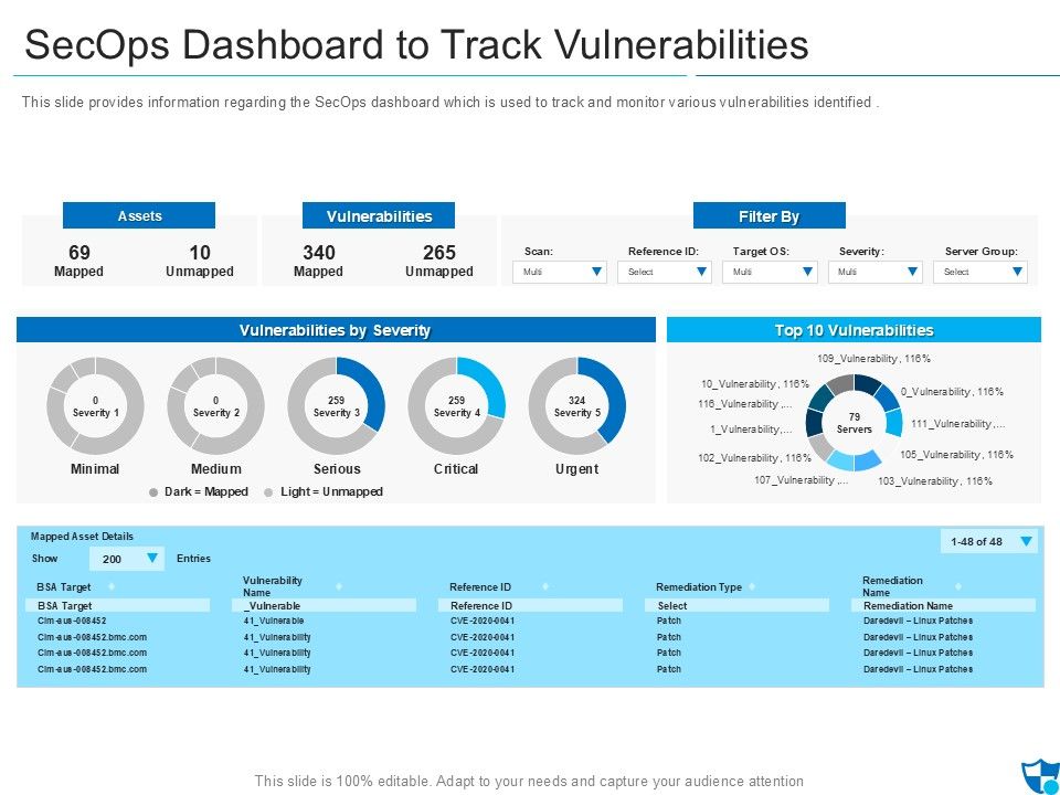 This slide provides information regarding the SecOps dashboard which is used to track and monitor various vulnerabilities identified. Deliver an awe inspiring pitch with this creative secops dashboard to track vulnerabilities clipart pdf bundle. Topics like assets, vulnerabilities, unmapped, vulnerabilities by severity, minimal can be discussed with this completely editable template. It is available for immediate download depending on the needs and requirements of the user.