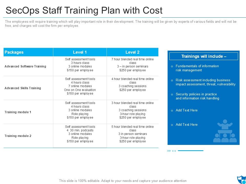 The employees will require training which will play important role in their development. The training will be given by experts of various fields and will not be free, and charges will cost the firm per employee. Deliver and pitch your topic in the best possible manner with this secops staff training plan with cost ideas pdf. Use them to share invaluable insights on fundamentals of information, impact assessment threat vulnerability, security policies in practice and impress your audience. This template can be altered and modified as per your expectations. So, grab it now.