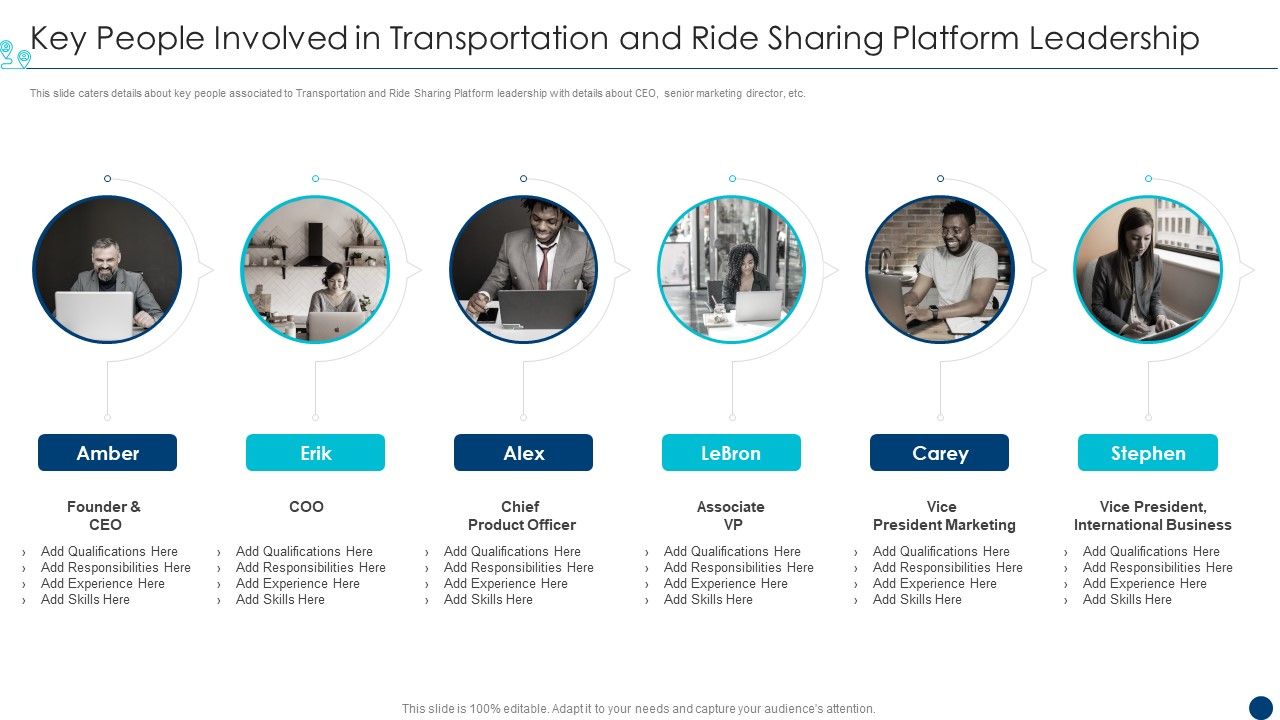 This slide caters details about key people associated to Transportation and Ride Sharing Platform leadership with details about CEO, senior marketing director, etc.This is a shipment services pitch deck key people involved in transportation and ride sharing platform leadership introduction pdf template with various stages. Focus and dispense information on six stages using this creative set, that comes with editable features. It contains large content boxes to add your information on topics like qualifications, responsibilities, experience You can also showcase facts, figures, and other relevant content using this PPT layout. Grab it now.