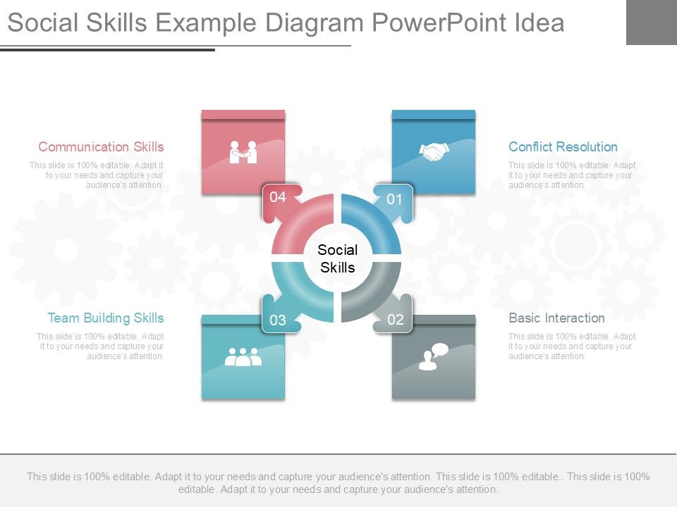 This is a social skills example diagram powerpoint idea. This is a four stage process. The stages in this process are social skills, conflict resolution, basic interaction, communication skills, team building skills.