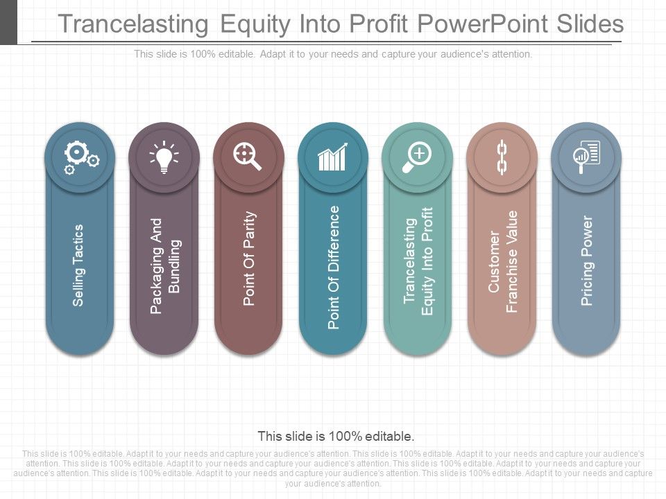 This is a trancelasting equity into profit powerpoint slides. This is a seven stage process. The stages in this process are selling tactics, packaging and bundling, point of parity, point of difference, trancelasting equity into profit, customer franchise value, pricing power.