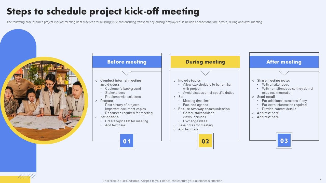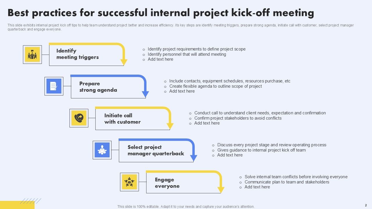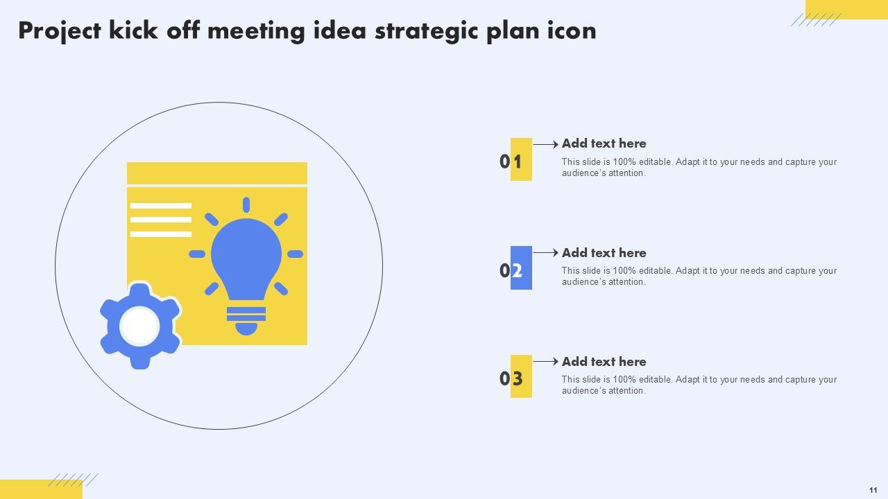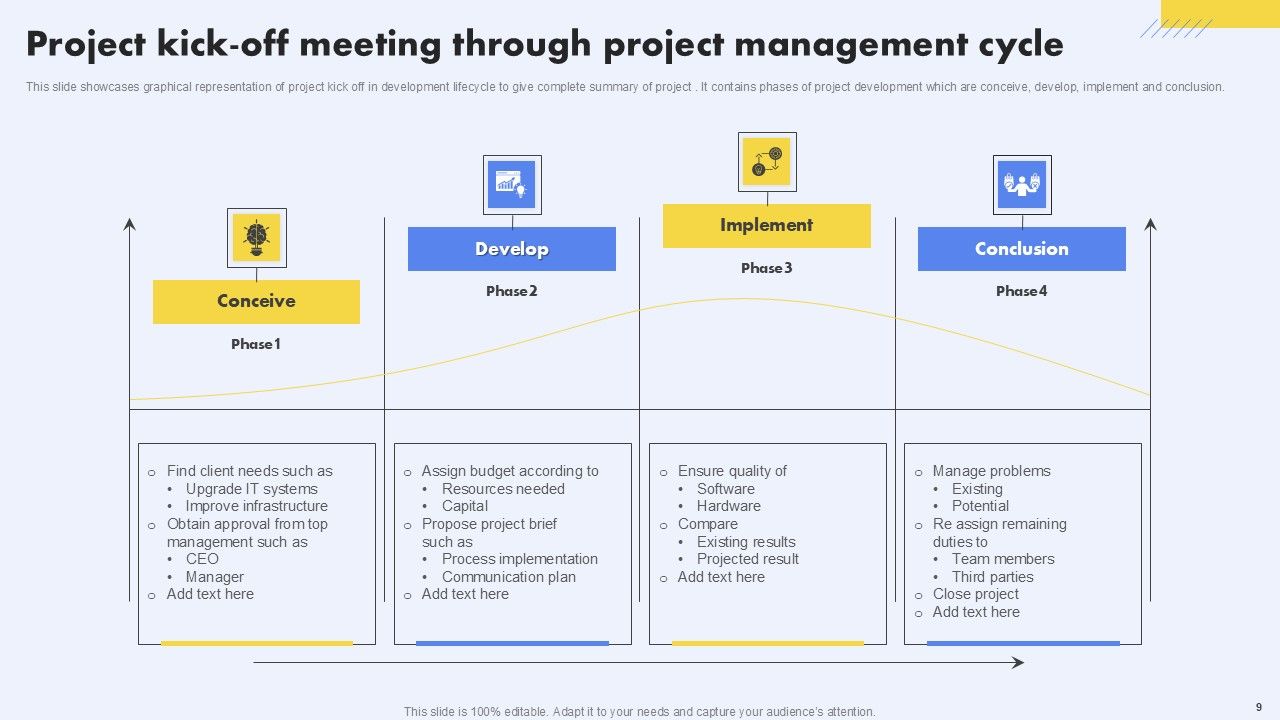 Share a great deal of information on the topic by deploying this Project Kick Off Meeting Ppt PowerPoint Presentation Complete Deck With Slides. Support your ideas and thought process with this prefabricated set. It includes a set of twelve slides, all fully modifiable and editable. Each slide can be restructured and induced with the information and content of your choice. You can add or remove large content boxes as well, to make this PPT slideshow more personalized. Its high-quality graphics and visuals help in presenting a well-coordinated pitch. This PPT template is also a resourceful tool to take visual cues from and implement the best ideas to help your business grow and expand. The main attraction of this well-formulated deck is that everything is editable, giving you the freedom to adjust it to your liking and choice. Changes can be made in the background and theme as well to deliver an outstanding pitch. Therefore, click on the download button now to gain full access to this multifunctional set.
