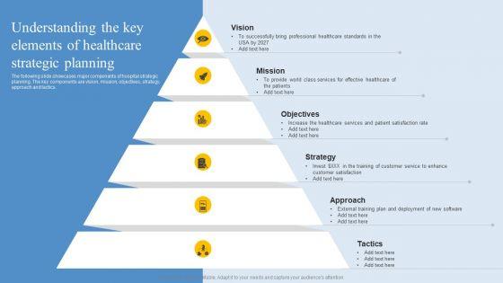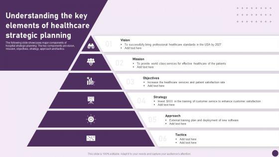 The following slide showcases major components of hospital strategic planning. The key components are vision, mission, objectives, strategy, approach and tactics. Do you have an important presentation coming up Are you looking for something that will make your presentation stand out from the rest Look no further than Guide To Healthcare Services Administration Understanding The Key Elements Of Healthcare Strategic Planning Formats PDF. With our professional designs, you can trust that your presentation will pop and make delivering it a smooth process. And with Slidegeeks, you can trust that your presentation will be unique and memorable. So why wait Grab Guide To Healthcare Services Administration Understanding The Key Elements Of Healthcare Strategic Planning Formats PDF today and make your presentation stand out from the rest.