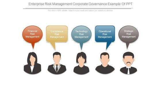 This is a enterprise risk management corporate governance example of ppt. This is a five stage process. The stages in this process are financial risk management, compliance risk management, technology risk, operational risk management management, strategic risk management.