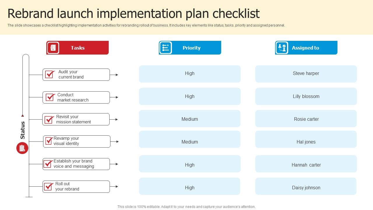 The slide showcases a checklist highlighting implementation activities for rebranding rollout of business. It includes key elements like status, tasks, priority and assigned personnel. Showcasing this set of slides titled Rebrand Launch Implementation Plan Checklist Topics PDF. The topics addressed in these templates are Audit Current Brand, Conduct Market Research, Mission Statement. All the content presented in this PPT design is completely editable. Download it and make adjustments in color, background, font etc. as per your unique business setting.