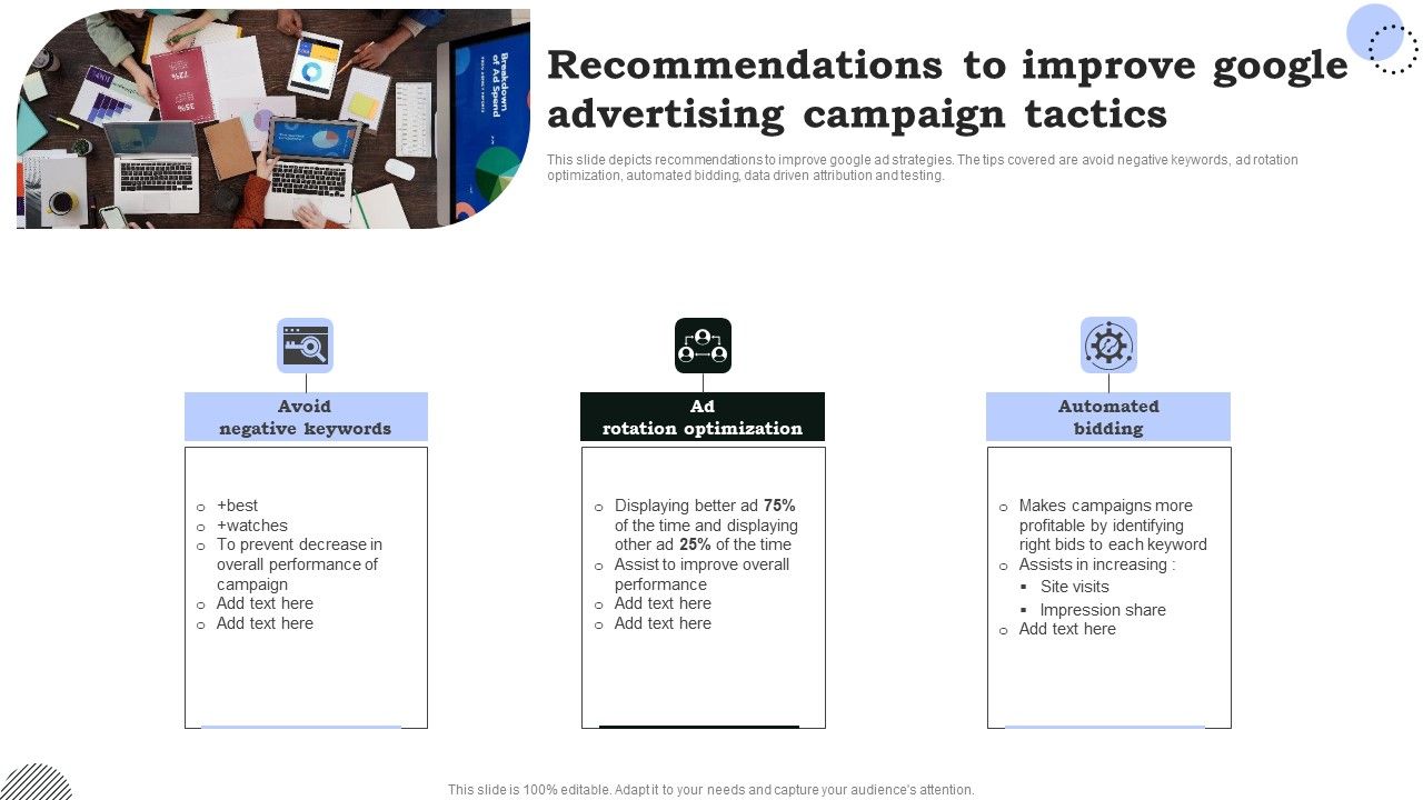 This slide depicts recommendations to improve google ad strategies. The tips covered are avoid negative keywords, ad rotation optimization, automated bidding, data driven attribution and testing. Persuade your audience using this Recommendations To Improve Google Advertising Campaign Tactics Structure PDF. This PPT design covers three stages, thus making it a great tool to use. It also caters to a variety of topics including Negative Keywords, Rotation Optimization, Automated Bidding . Download this PPT design now to present a convincing pitch that not only emphasizes the topic but also showcases your presentation skills.