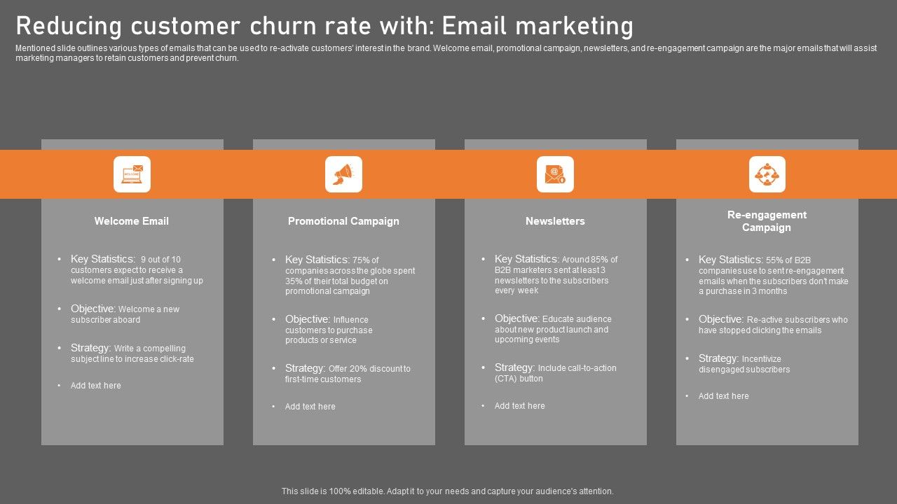 Mentioned slide outlines various types of emails that can be used to re-activate customers interest in the brand. Welcome email, promotional campaign, newsletters, and re-engagement campaign are the major emails that will assist marketing managers to retain customers and prevent churn. Do you have an important presentation coming up Are you looking for something that will make your presentation stand out from the rest Look no further than Reducing Customer Churn Rate With Email Marketing Background PDF. With our professional designs, you can trust that your presentation will pop and make delivering it a smooth process. And with Slidegeeks, you can trust that your presentation will be unique and memorable. So why wait Grab Reducing Customer Churn Rate With Email Marketing Background PDF today and make your presentation stand out from the rest.