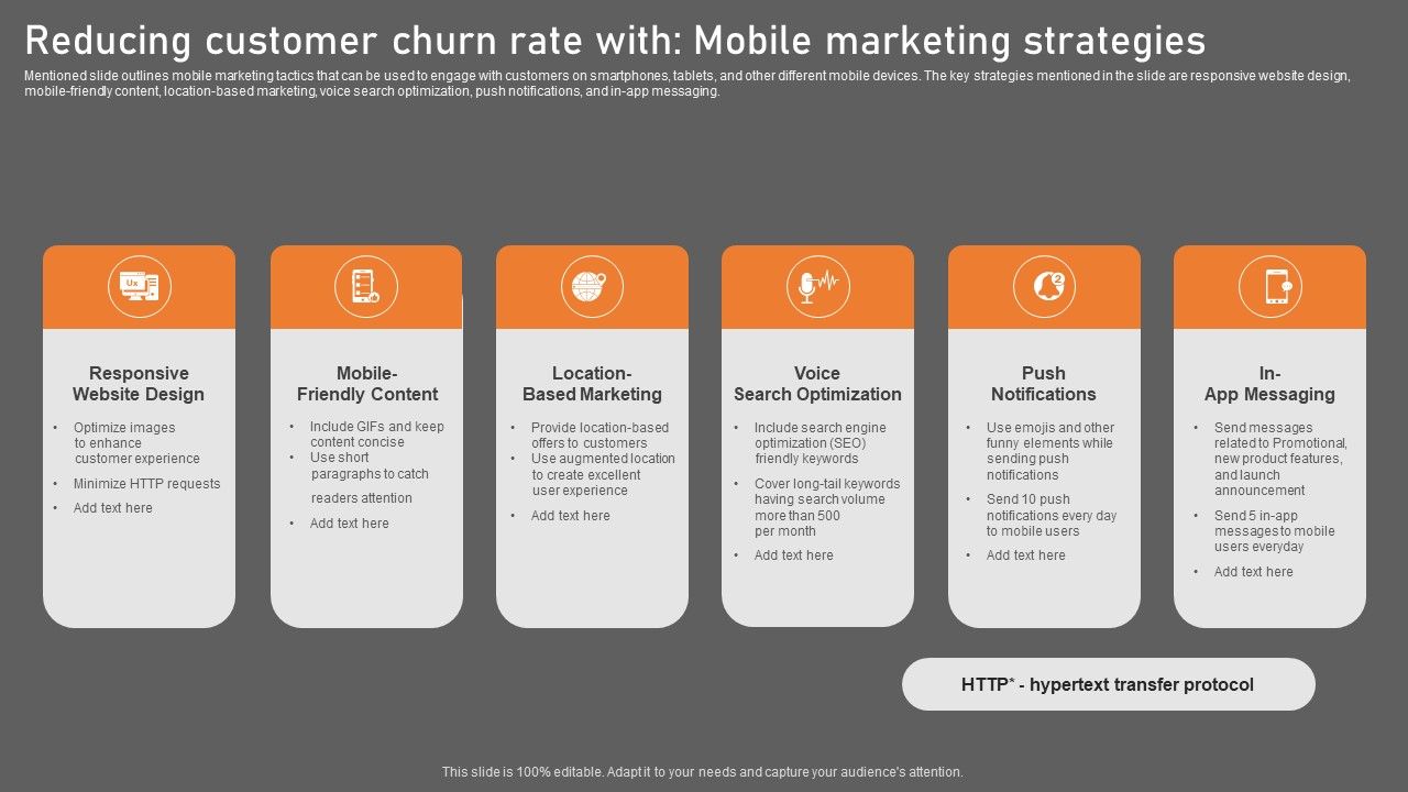 Mentioned slide outlines mobile marketing tactics that can be used to engage with customers on smartphones, tablets, and other different mobile devices. The key strategies mentioned in the slide are responsive website design, mobile-friendly content, location-based marketing, voice search optimization, push notifications, and in-app messaging. Whether you have daily or monthly meetings, a brilliant presentation is necessary. Reducing Customer Churn Rate With Mobile Marketing Strategies Portrait PDF can be your best option for delivering a presentation. Represent everything in detail using Reducing Customer Churn Rate With Mobile Marketing Strategies Portrait PDF and make yourself stand out in meetings. The template is versatile and follows a structure that will cater to your requirements. All the templates prepared by Slidegeeks are easy to download and edit. Our research experts have taken care of the corporate themes as well. So, give it a try and see the results.
