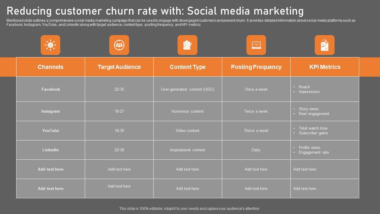 Mentioned slide outlines a comprehensive social media marketing campaign that can be used to engage with disengaged customers and prevent churn. It provides detailed information about social media platforms such as Facebook, Instagram, YouTube, and LinkedIn along with target audience, content type, posting frequency, and KPI metrics. Slidegeeks has constructed Reducing Customer Churn Rate With Social Media Marketing Infographics PDF after conducting extensive research and examination. These presentation templates are constantly being generated and modified based on user preferences and critiques from editors. Here, you will find the most attractive templates for a range of purposes while taking into account ratings and remarks from users regarding the content. This is an excellent jumping off point to explore our content and will give new users an insight into our top notch PowerPoint Templates.