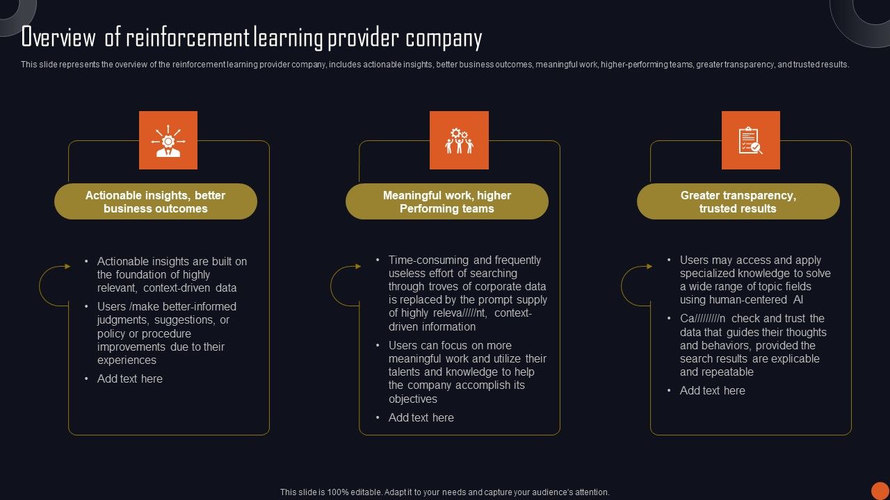 This slide represents the overview of the reinforcement learning provider company, includes actionable insights, better business outcomes, meaningful work, higher-performing teams, greater transparency, and trusted results. Formulating a presentation can take up a lot of effort and time, so the content and message should always be the primary focus. The visuals of the PowerPoint can enhance the presenters message, so our Reinforcement Learning Principles And Techniques Overview Reinforcement Learning Provider Company Inspiration PDF was created to help save time. Instead of worrying about the design, the presenter can concentrate on the message while our designers work on creating the ideal templates for whatever situation is needed. Slidegeeks has experts for everything from amazing designs to valuable content, we have put everything into Reinforcement Learning Principles And Techniques Overview Reinforcement Learning Provider Company Inspiration PDF
