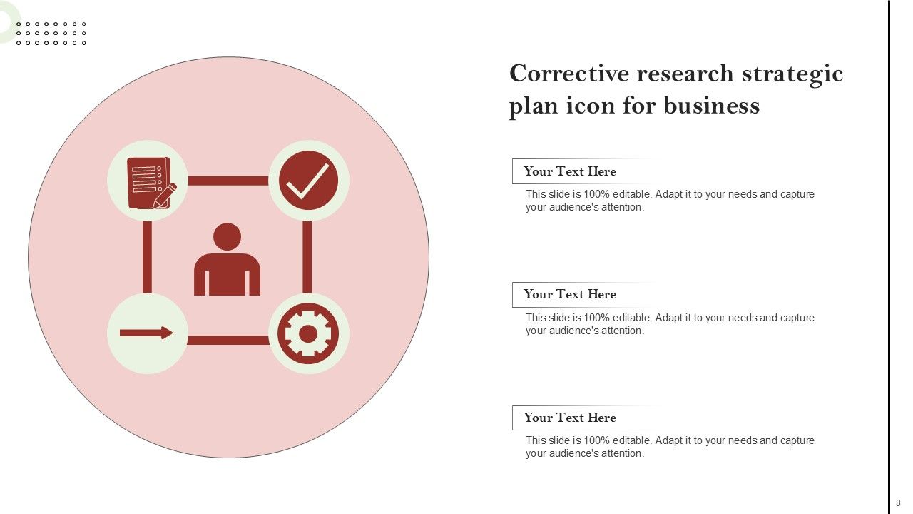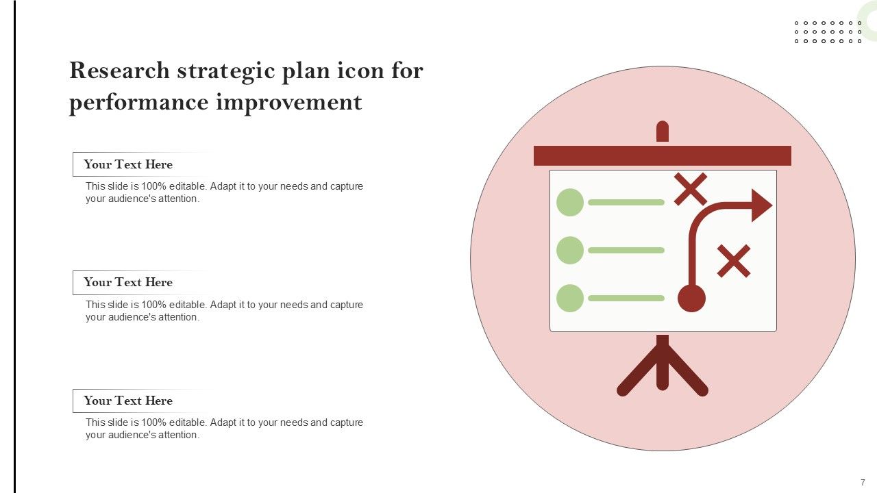 Improve your presentation delivery using this Research Strategic Plan Ppt PowerPoint Presentation Complete Deck With Slides. Support your business vision and objectives using this well-structured PPT deck. This template offers a great starting point for delivering beautifully designed presentations on the topic of your choice. Comprising nine this professionally designed template is all you need to host discussion and meetings with collaborators. Each slide is self-explanatory and equipped with high-quality graphics that can be adjusted to your needs. Therefore, you will face no difficulty in portraying your desired content using this PPT slideshow. This PowerPoint slideshow contains every important element that you need for a great pitch. It is not only editable but also available for immediate download and utilization. The color, font size, background, shapes everything can be modified to create your unique presentation layout. Therefore, download it now.