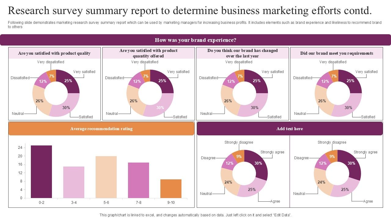 Following slide demonstrates summary result of marketing research survey conducted by marketing manager to determine brand position in market. It includes elements such as customer awareness about brand and product usage by customer. Pitch your topic with ease and precision using this Research Survey Summary Report To Determine Business Marketing Efforts Survey SS. This layout presents information on Brand Awareness, Probability. It is also available for immediate download and adjustment. So, changes can be made in the color, design, graphics or any other component to create a unique layout.
