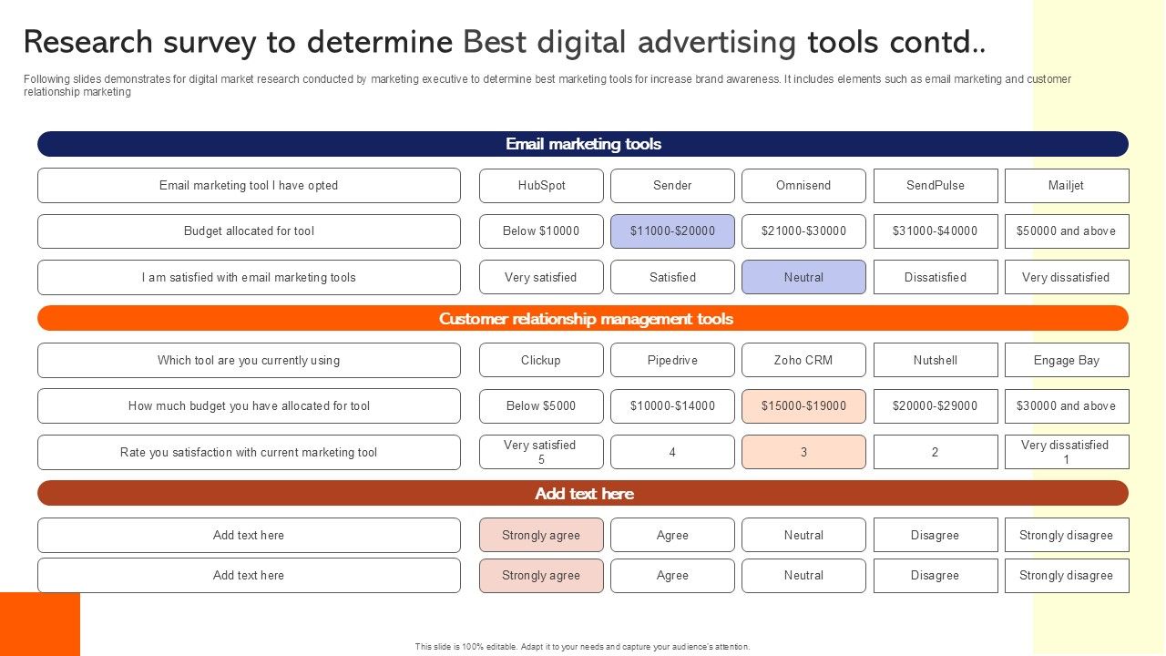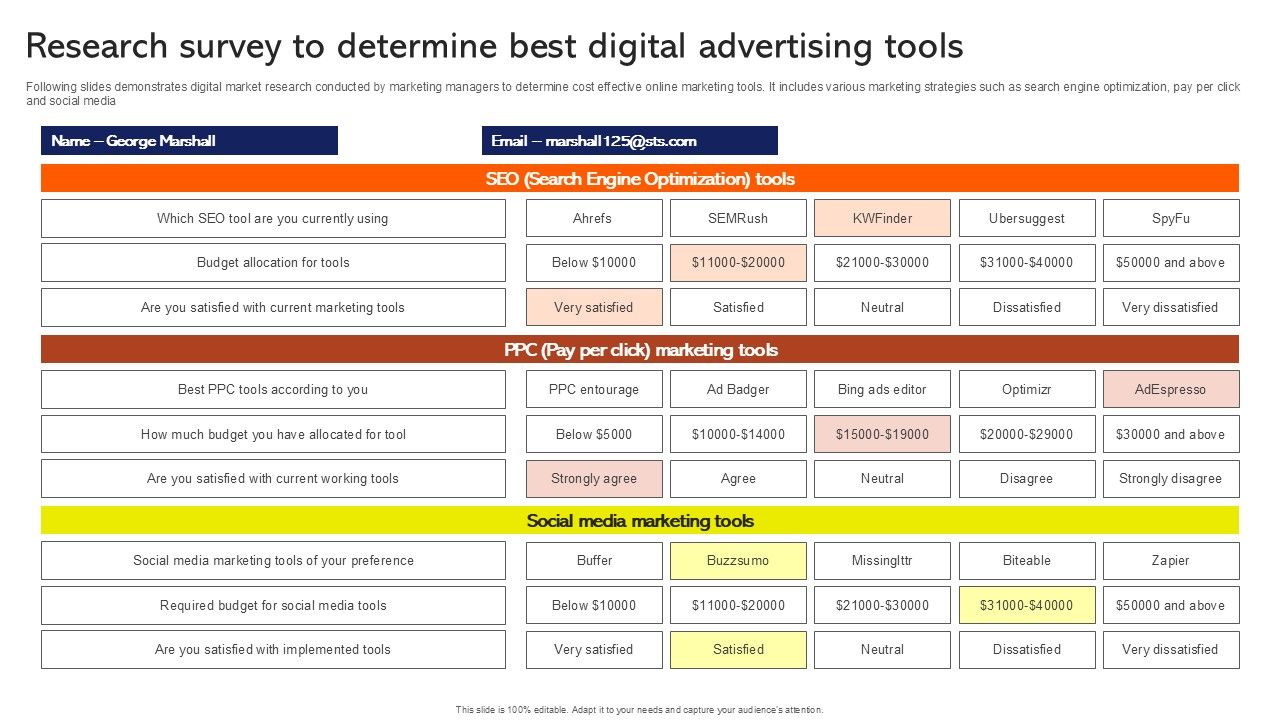 Following slides demonstrates digital market research conducted by marketing managers to determine cost effective online marketing tools. It includes various marketing strategies such as search engine optimization, pay per click and social media. Showcasing this set of slides titled Research Survey To Determine Best Digital Advertising Tools Survey SS. The topics addressed in these templates are Search Engine Optimization Tools, PPC Marketing Tools, Social Media Marketing Tools. All the content presented in this PPT design is completely editable. Download it and make adjustments in color, background, font etc. as per your unique business setting.