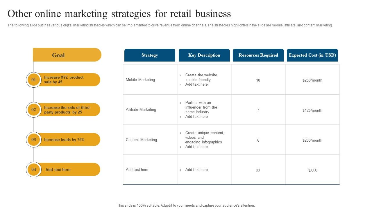 The following slide outlines various digital marketing strategies which can be implemented to drive revenue from online channels. The strategies highlighted in the slide are mobile, affiliate, and content marketing. Welcome to our selection of the Retail Ecommerce Merchandising Tactics For Boosting Revenue Other Online Marketing Strategies For Retail Business Background PDF. These are designed to help you showcase your creativity and bring your sphere to life. Planning and Innovation are essential for any business that is just starting out. This collection contains the designs that you need for your everyday presentations. All of our PowerPoints are 100 percent editable, so you can customize them to suit your needs. This multi purpose template can be used in various situations. Grab these presentation templates today.