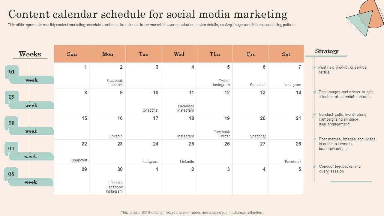 This slide represents monthly content marketing schedule to enhance brand reach in the market. It covers product or service details, posting images and videos, conducting polls etc. Are you in need of a template that can accommodate all of your creative concepts This one is crafted professionally and can be altered to fit any style. Use it with Google Slides or PowerPoint. Include striking photographs, symbols, depictions, and other visuals. Fill, move around, or remove text boxes as desired. Test out color palettes and font mixtures. Edit and save your work, or work with colleagues. Download Retail Promotion Strategies To Elevate Shopper Content Calendar Schedule For Social Media Inspiration PDF and observe how to make your presentation outstanding. Give an impeccable presentation to your group and make your presentation unforgettable.