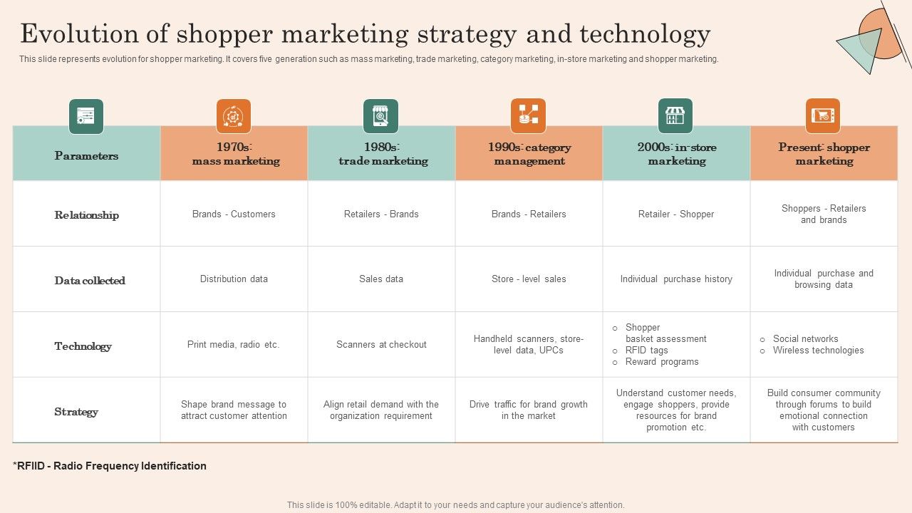 This slide represents evolution for shopper marketing. It covers five generation such as mass marketing, trade marketing, category marketing, in-store marketing and shopper marketing. Boost your pitch with our creative Retail Promotion Strategies To Elevate Shopper Evolution Of Shopper Marketing Strategy Designs PDF. Deliver an awe-inspiring pitch that will mesmerize everyone. Using these presentation templates you will surely catch everyones attention. You can browse the ppts collection on our website. We have researchers who are experts at creating the right content for the templates. So you do not have to invest time in any additional work. Just grab the template now and use them.