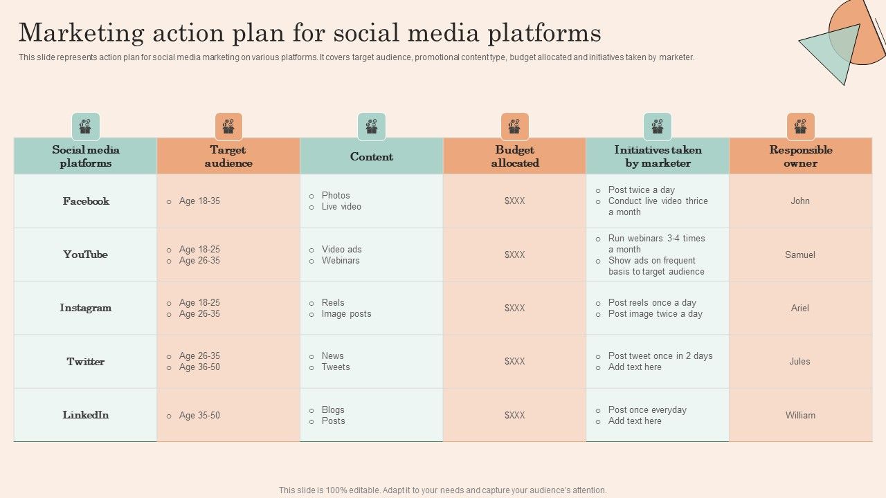 This slide represents action plan for social media marketing on various platforms. It covers target audience, promotional content type, budget allocated and initiatives taken by marketer. Explore a selection of the finest Retail Promotion Strategies To Elevate Shopper Marketing Action Plan For Social Media Platforms Information PDF here. With a plethora of professionally designed and pre made slide templates, you can quickly and easily find the right one for your upcoming presentation. You can use our Retail Promotion Strategies To Elevate Shopper Marketing Action Plan For Social Media Platforms Information PDF to effectively convey your message to a wider audience. Slidegeeks has done a lot of research before preparing these presentation templates. The content can be personalized and the slides are highly editable. Grab templates today from Slidegeeks.