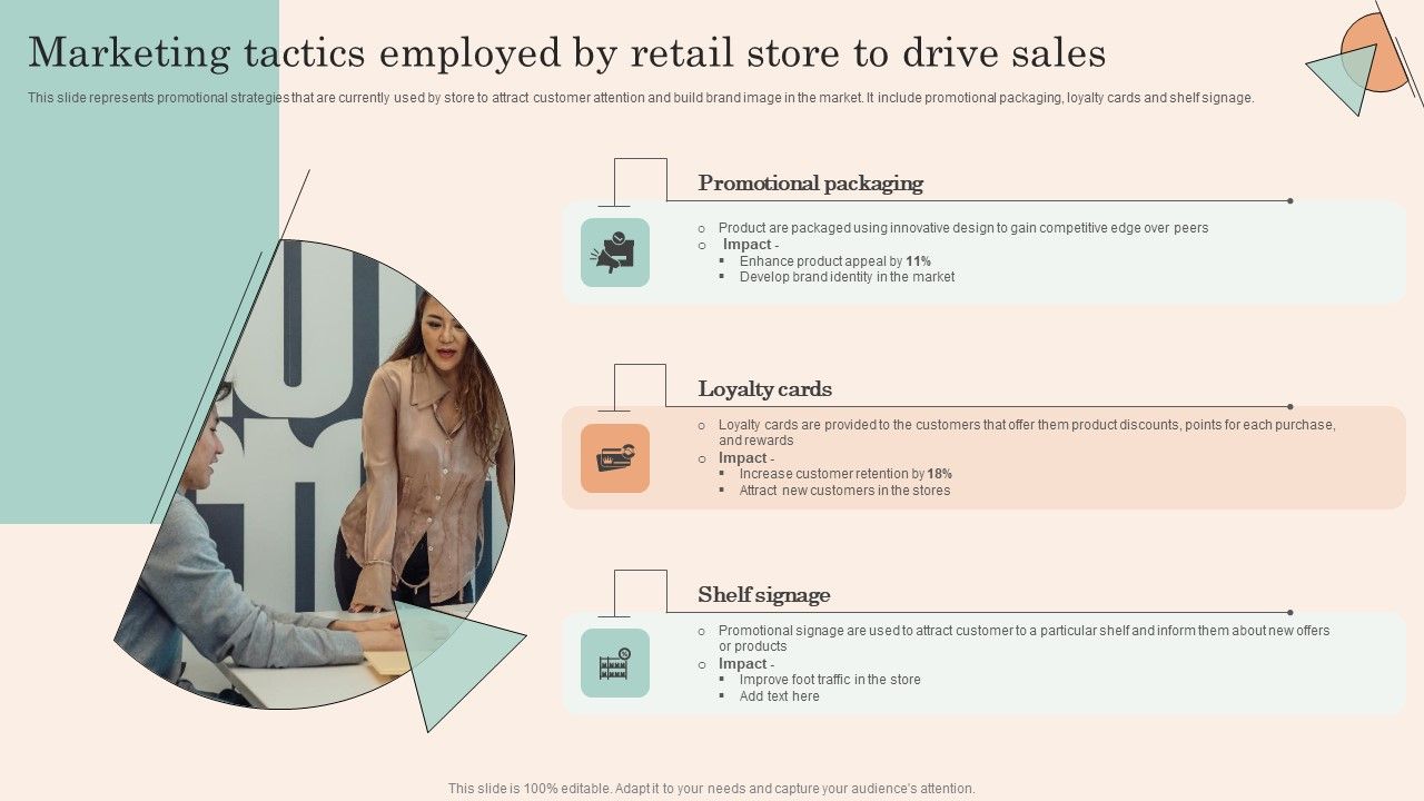 This slide represents promotional strategies that are currently used by store to attract customer attention and build brand image in the market. It include promotional packaging, loyalty cards and shelf signage. From laying roadmaps to briefing everything in detail, our templates are perfect for you. You can set the stage with your presentation slides. All you have to do is download these easy to edit and customizable templates. Retail Promotion Strategies To Elevate Shopper Marketing Tactics Employed By Retail Store Download PDF will help you deliver an outstanding performance that everyone would remember and praise you for. Do download this presentation today.