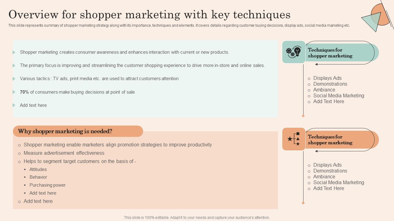 This slide represents summary of shopper marketing strategy along with its importance, techniques and elements. It covers details regarding customer buying decisions, display ads, social media marketing etc. Slidegeeks is here to make your presentations a breeze with Retail Promotion Strategies To Elevate Shopper Overview For Shopper Marketing With Key Pictures PDF With our easy to use and customizable templates, you can focus on delivering your ideas rather than worrying about formatting. With a variety of designs to choose from, you are sure to find one that suits your needs. And with animations and unique photos, illustrations, and fonts, you can make your presentation pop. So whether you are giving a sales pitch or presenting to the board, make sure to check out Slidegeeks first.