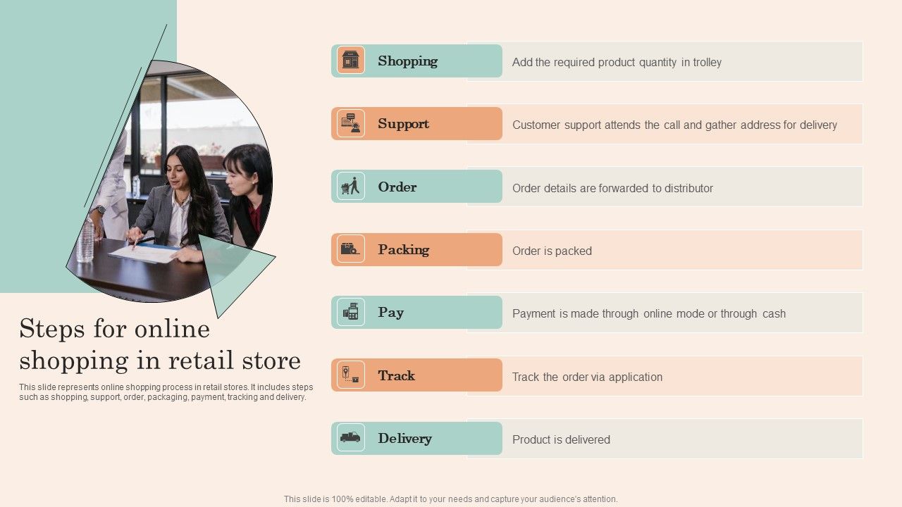 This slide represents online shopping process in retail stores. It includes steps such as shopping, support, order, packaging, payment, tracking and delivery. Slidegeeks is here to make your presentations a breeze with Retail Promotion Strategies To Elevate Shopper Steps For Online Shopping In Retail Store Diagrams PDF With our easy to use and customizable templates, you can focus on delivering your ideas rather than worrying about formatting. With a variety of designs to choose from, you are sure to find one that suits your needs. And with animations and unique photos, illustrations, and fonts, you can make your presentation pop. So whether you are giving a sales pitch or presenting to the board, make sure to check out Slidegeeks first.