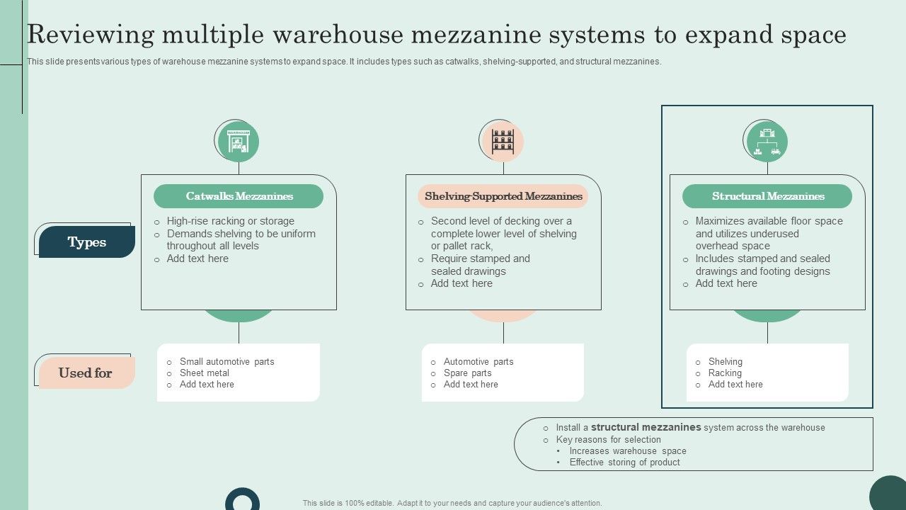 This slide presents various types of warehouse mezzanine systems to expand space. It includes types such as catwalks, shelving-supported, and structural mezzanines. If your project calls for a presentation, then Slidegeeks is your go-to partner because we have professionally designed, easy-to-edit templates that are perfect for any presentation. After downloading, you can easily edit Reviewing Multiple Warehouse Mezzanine Systems To Expand Space Topics PDF and make the changes accordingly. You can rearrange slides or fill them with different images. Check out all the handy templates