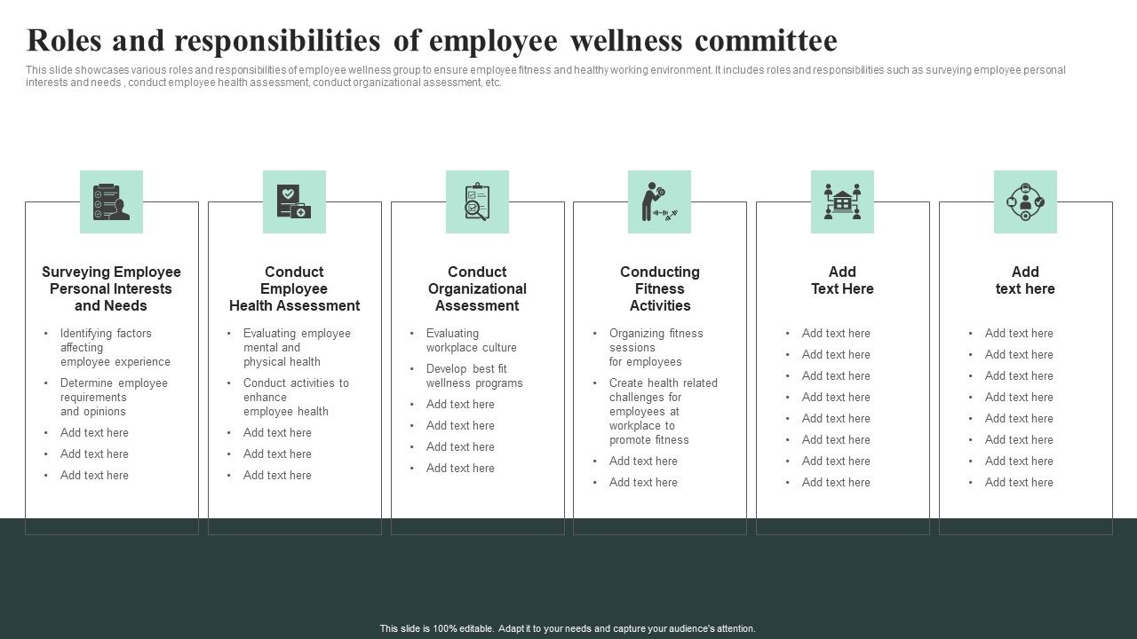 This slide showcases various roles and responsibilities of employee wellness group to ensure employee fitness and healthy working environment. It includes roles and responsibilities such as surveying employee personal interests and needs , conduct employee health assessment, conduct organizational assessment, etc. This Roles And Responsibilities Of Employee Wellness Committee Graphics PDF from Slidegeeks makes it easy to present information on your topic with precision. It provides customization options, so you can make changes to the colors, design, graphics, or any other component to create a unique layout. It is also available for immediate download, so you can begin using it right away. Slidegeeks has done good research to ensure that you have everything you need to make your presentation stand out. Make a name out there for a brilliant performance.