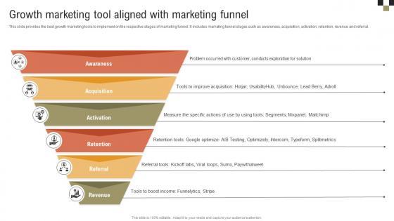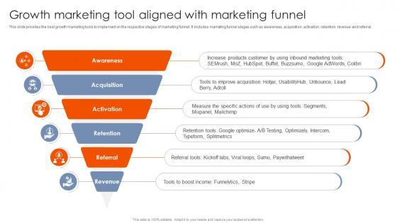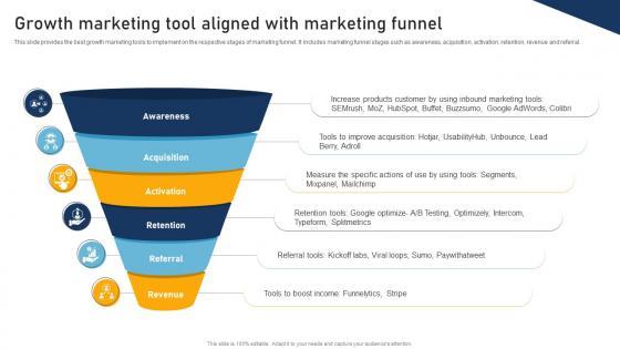 This slide provides the best growth marketing tools to implement on the respective stages of marketing funnel. It includes marketing funnel stages such as awareness, acquisition, activation, retention, revenue and referral. Whether you have daily or monthly meetings, a brilliant presentation is necessary. A Comprehensive Guide On Growth Marketing Tool Aligned With Marketing Funnel MKT SS V can be your best option for delivering a presentation. Represent everything in detail using A Comprehensive Guide On Growth Marketing Tool Aligned With Marketing Funnel MKT SS V and make yourself stand out in meetings. The template is versatile and follows a structure that will cater to your requirements. All the templates prepared by Slidegeeks are easy to download and edit. Our research experts have taken care of the corporate themes as well. So, give it a try and see the results.