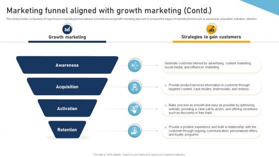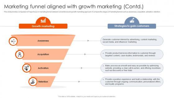 This slide provides comparison of major focus in marketing funnel between conventional and growth marketing approach. It compare the stages of marketing funnel such as awareness, acquisition, activation, retention. If your project calls for a presentation, then Slidegeeks is your go-to partner because we have professionally designed, easy-to-edit templates that are perfect for any presentation. After downloading, you can easily edit A Comprehensive Approach To Marketing Funnel Aligned With Growth Marketing MKT SS V and make the changes accordingly. You can rearrange slides or fill them with different images. Check out all the handy templates