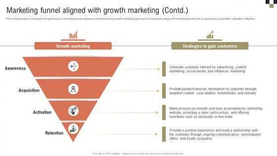 This slide provides comparison of major focus in marketing funnel between conventional and growth marketing approach. It compare the stages of marketing funnel such as awareness, acquisition, activation, retention. Welcome to our selection of the A Comprehensive Guide On Marketing Funnel Aligned With Growth Marketing MKT SS V. These are designed to help you showcase your creativity and bring your sphere to life. Planning and Innovation are essential for any business that is just starting out. This collection contains the designs that you need for your everyday presentations. All of our PowerPoints are 100Percent editable, so you can customize them to suit your needs. This multi-purpose template can be used in various situations. Grab these presentation templates today.