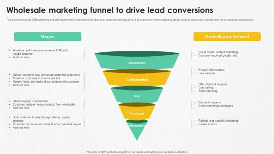 This slide showcases B2B marketing and sales funnel which showcases key phases in customer buying journey. It provides information regarding stages such as awareness, consideration, trial, purchase and advocacy. Create an editable B2B Marketing Techniques To Increase Wholesale Marketing Funnel To Drive Lead Conversions that communicates your idea and engages your audience. Whether you are presenting a business or an educational presentation, pre-designed presentation templates help save time. B2B Marketing Techniques To Increase Wholesale Marketing Funnel To Drive Lead Conversions is highly customizable and very easy to edit, covering many different styles from creative to business presentations. Slidegeeks has creative team members who have crafted amazing templates. So, go and get them without any delay.