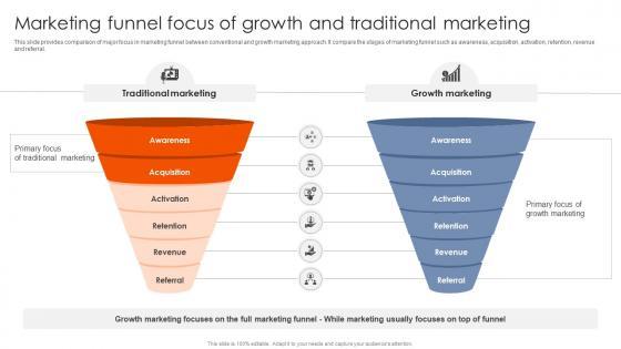 This slide provides comparison of major focus in marketing funnel between conventional and growth marketing approach. It compare the stages of marketing funnel such as awareness, acquisition, activation, retention, revenue and referral. Do you have an important presentation coming up Are you looking for something that will make your presentation stand out from the rest Look no further than A Comprehensive Guide On Growth Marketing Funnel Focus Of Growth And Traditional MKT SS V. With our professional designs, you can trust that your presentation will pop and make delivering it a smooth process. And with Slidegeeks, you can trust that your presentation will be unique and memorable. So why wait Grab A Comprehensive Guide On Growth Marketing Funnel Focus Of Growth And Traditional MKT SS V today and make your presentation stand out from the rest