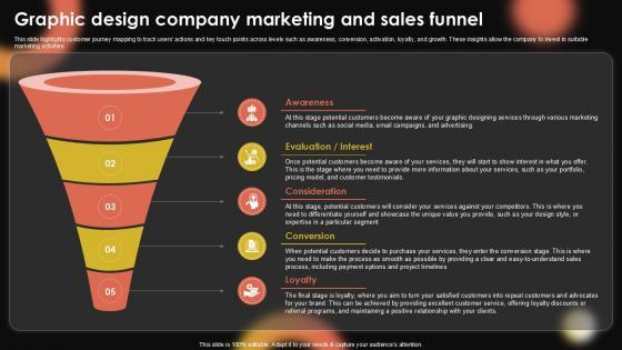 This slide highlights customer journey mapping to track users actions and key touch points across levels such as awareness, conversion, activation, loyalty, and growth. These insights allow the company to invest in suitable marketing activities. Whether you have daily or monthly meetings, a brilliant presentation is necessary. Graphic Design Company Marketing Sample Pentagram Business Plan PPT PowerPoint BP SS V can be your best option for delivering a presentation. Represent everything in detail using Graphic Design Company Marketing Sample Pentagram Business Plan PPT PowerPoint BP SS V and make yourself stand out in meetings. The template is versatile and follows a structure that will cater to your requirements. All the templates prepared by Slidegeeks are easy to download and edit. Our research experts have taken care of the corporate themes as well. So, give it a try and see the results.