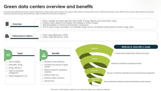 This slide represents the introduction of green data centers and their performance metrics. The purpose of this slide is to showcase the various methods to deal with e-waste, different types of green data centers such as green buildings, renewable energy, energy efficiency, water management, and waste management. Make sure to capture your audiences attention in your business displays with our gratis customizable Green Computing Green Data Centers Overview And Benefits These are great for business strategies, office conferences, capital raising or task suggestions. If you desire to acquire more customers for your tech business and ensure they stay satisfied, create your own sales presentation with these plain slides.