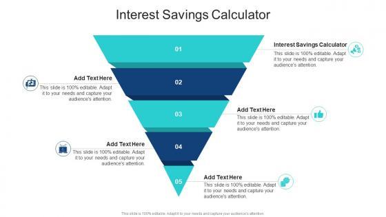 Presenting our innovatively designed set of slides titled Interest Savings Calculator In Powerpoint And Google Slides Cpb. This completely editable PowerPoint graphic exhibits Interest Savings Calculator that will help you convey the message impactfully. It can be accessed with Google Slides and is available in both standard screen and widescreen aspect ratios. Apart from this, you can download this well structured PowerPoint template design in different formats like PDF, JPG, and PNG. So, click the download button now to gain full access to this PPT design.