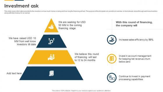 This slide covers information provided to the investors on how much money is being and how long the financing will last. The purpose of this template is to provide an overview on fund already raised through well know investors along with total revenue to be earned. Whether you have daily or monthly meetings, a brilliant presentation is necessary. Investment Ask Payroll Solutions Provider Investor Funding Elevator Pitch Deck can be your best option for delivering a presentation. Represent everything in detail using Investment Ask Payroll Solutions Provider Investor Funding Elevator Pitch Deck and make yourself stand out in meetings. The template is versatile and follows a structure that will cater to your requirements. All the templates prepared by Slidegeeks are easy to download and edit. Our research experts have taken care of the corporate themes as well. So, give it a try and see the results.