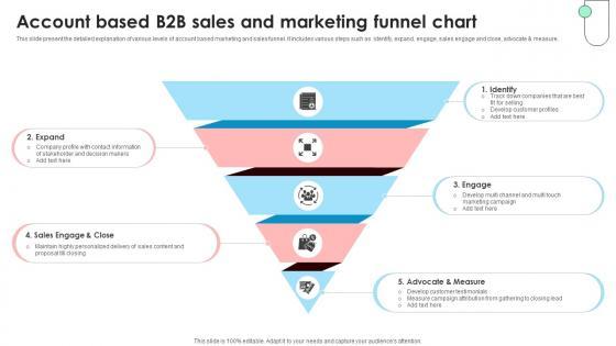 This slide present the detailed explanation of various levels of account based marketing and sales funnel. It includes various steps such as identify, expand, engage, sales engage and close, advocate and measure. Create an editable Navigating B2B Sales Account Based B2B Sales And Marketing Funnel SA SS V that communicates your idea and engages your audience. Whether you are presenting a business or an educational presentation, pre-designed presentation templates help save time. Navigating B2B Sales Account Based B2B Sales And Marketing Funnel SA SS V is highly customizable and very easy to edit, covering many different styles from creative to business presentations. Slidegeeks has creative team members who have crafted amazing templates. So, go and get them without any delay.