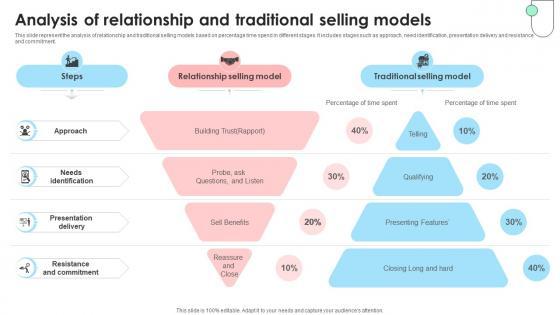 This slide represent the analysis of relationship and traditional selling models based on percentage time spend in different stages. It includes stages such as approach, need identification, presentation delivery and resistance and commitment. Do you have to make sure that everyone on your team knows about any specific topic I yes, then you should give Navigating B2B Sales Analysis Of Relationship And Traditional Selling Models SA SS V a try. Our experts have put a lot of knowledge and effort into creating this impeccable Navigating B2B Sales Analysis Of Relationship And Traditional Selling Models SA SS V. You can use this template for your upcoming presentations, as the slides are perfect to represent even the tiniest detail. You can download these templates from the Slidegeeks website and these are easy to edit. So grab these today