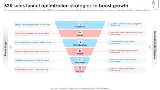 This slide showcases optimization strategies for various stages of B2B sales funnel stages to improve overall growth. It covers optimization techniques for awareness, interest, consideration, intent, evaluation and decions. Do you have an important presentation coming up Are you looking for something that will make your presentation stand out from the rest Look no further than Navigating B2B Sales B2B Sales Funnel Optimization Strategies To Boost SA SS V. With our professional designs, you can trust that your presentation will pop and make delivering it a smooth process. And with Slidegeeks, you can trust that your presentation will be unique and memorable. So why wait Grab Navigating B2B Sales B2B Sales Funnel Optimization Strategies To Boost SA SS V today and make your presentation stand out from the rest