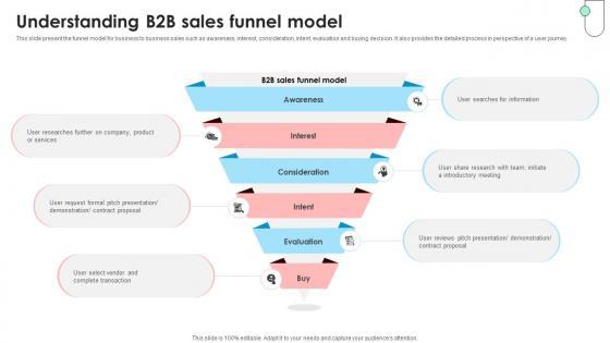 This slide present the funnel model for business to business sales such as awareness, interest, consideration, intent, evaluation and buying decision. It also provides the detailed process in perspective of a user journey. Make sure to capture your audiences attention in your business displays with our gratis customizable Navigating B2B Sales Understanding B2B Sales Funnel Model SA SS V. These are great for business strategies, office conferences, capital raising or task suggestions. If you desire to acquire more customers for your tech business and ensure they stay satisfied, create your own sales presentation with these plain slides.