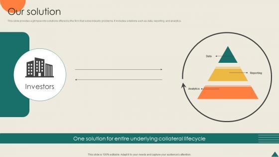 This slide provides a glimpse into solutions offered by the firm that solve industry problems. It includes solutions such as data, reporting, and analytics. Present like a pro with Our Solution Financial Analytics Platform Investor Elevator Pitch Deck. Create beautiful presentations together with your team, using our easy-to-use presentation slides. Share your ideas in real-time and make changes on the fly by downloading our templates. So whether you are in the office, on the go, or in a remote location, you can stay in sync with your team and present your ideas with confidence. With Slidegeeks presentation got a whole lot easier. Grab these presentations today.